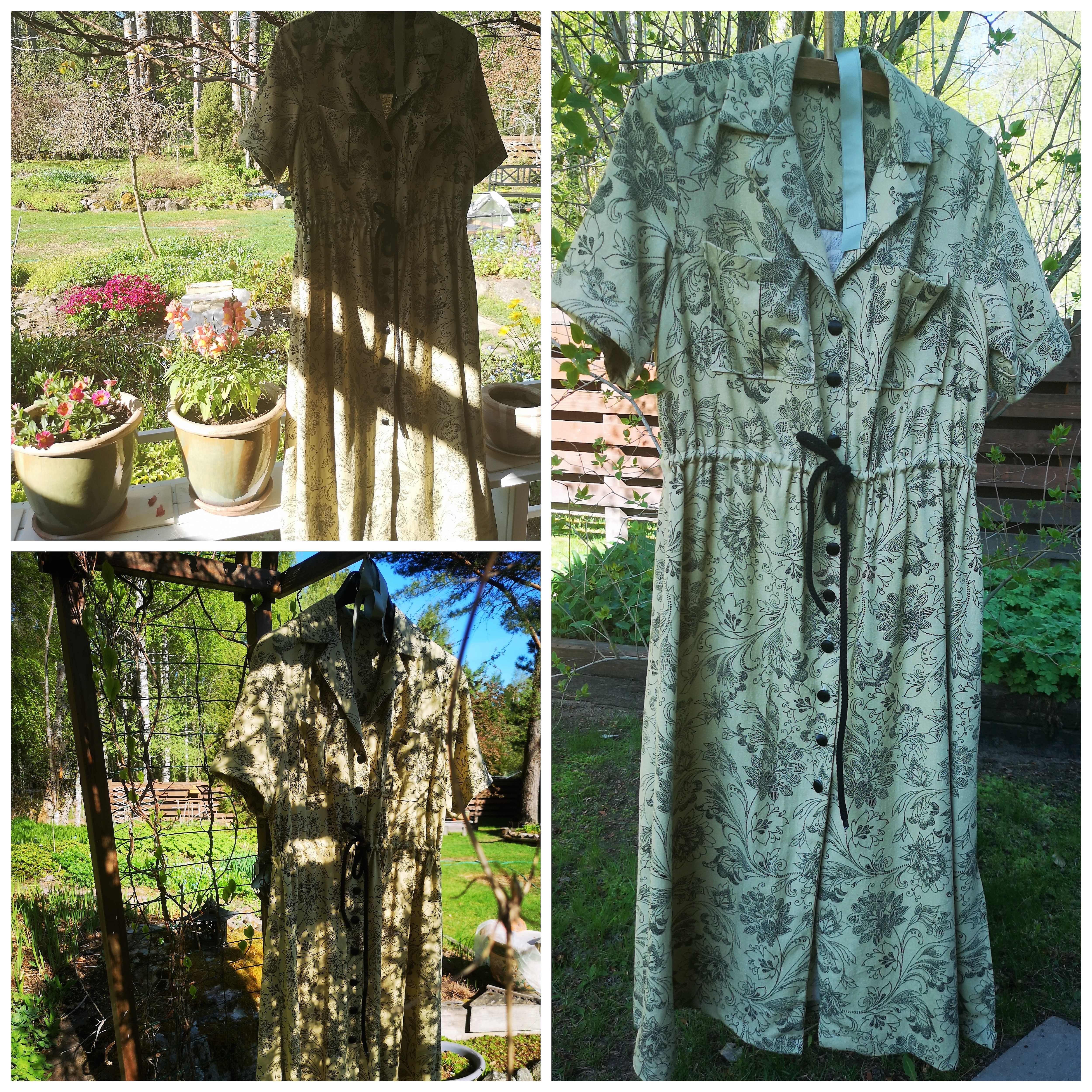 Myös tyttären mekko valmistui vihdoin. Olen jokusen vaatteen ommellut Named-kaavoilla ja minusta ne eivät ole hyviä. Mitoitus on outo ja tarkoitettu kai yli 180 cm mannekiineille? Onneksi tytär kävi sovittamassa täällä ja koko perhe oli mukana. Kankaan tyttäreni valitsi paikallisesta Eurokankaasta, se on pellavaviskoosia, jota on hyvä ommella ja joka ei kauheasti edes rypisty. Väri on tuollainen vihreähkö eli vaihtuu valossa. Tämän tyyppisiä värejä on nyt paljon pihatarhassa, kun lehdet puhkeavat. Varsinkin puiden lehdet tulevat mitä erilaisimmissa vihreän sävyissä. Meillä päin oli muutama lämmin päivä ja se teki ihmeitä pihalle kuten joka kevät ja puutarhurin tapaan nyt sitten kaivataan vettä, kun saatiin aurinkoa. t. HennaMar